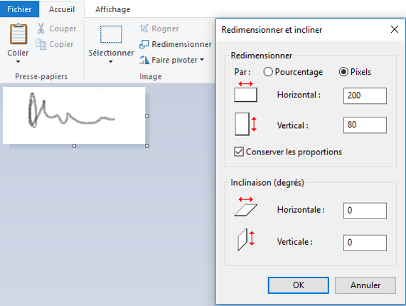 1) Scannez ou faites une photo de votre signature et enregistrez la sur votre ordinateur. 2) Si vous souhaitez retoucher l'image de votre signature, utilisez un logiciel tel que « Paint » (installé par défaut sur les PC)., redimensionnez ensuite l'image en 200/80 pixels. |