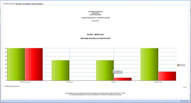 Lorsque vous consultez votre décompte de points, un premier affichage Convention médicale vous renseigne sur le nombre de points obtenus par thèmes (Organisation du cabinet, Suivi chronique, Prévention, Efficience thérapeutique) par rapport aux points que vous seriez susceptibles d’obtenir.