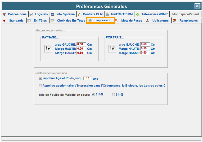 Dans cet onglet, après avoir testé l'impression, indiquez les marges d'impression nécessaires.