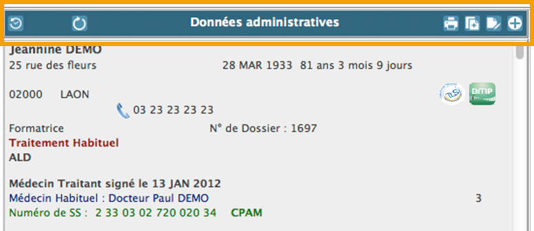 Les boutons de modification, création, duplication d’une fiche administrative sont dans le bandeau de la fiche administrative du dossier patient.