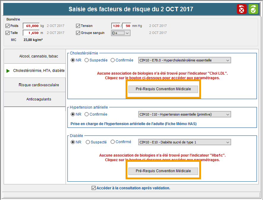 • soit le bouton Pré-Requis Convention Médicale, lors de la saisie des Facteurs de risque,