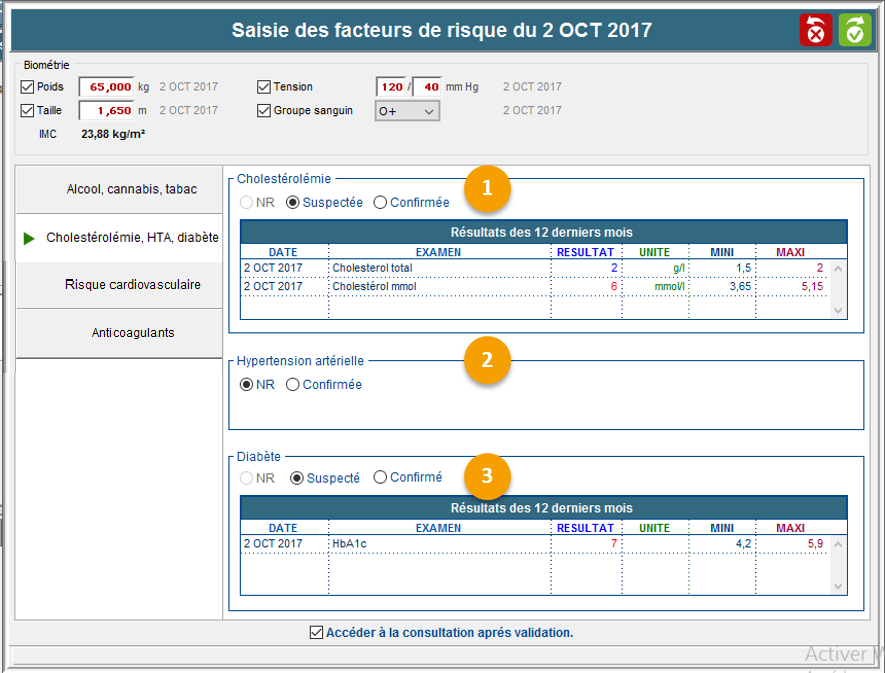 Cet onglet vous permet de savoir si les pathologies, cholestérolémie, hypertension et/ou diabète de votre patient sont respectivement non renseignée, suspectée ou confirmée.