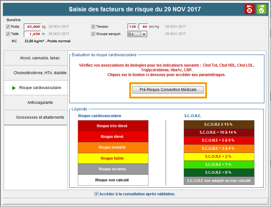 Le risque cardiovasculaire se calcule. Un S.C.O.R.E et une évaluation du risque cardiovasculaire s'affichent.