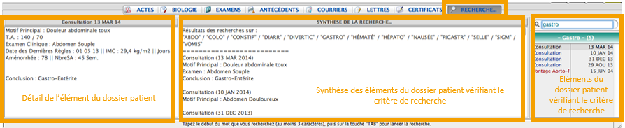 L’onglet Recherche (zone Type de données) vous permet de requêter votre base à la volée et de rechercher dans le dossier patient sélectionné un mot-clé spécifique.
