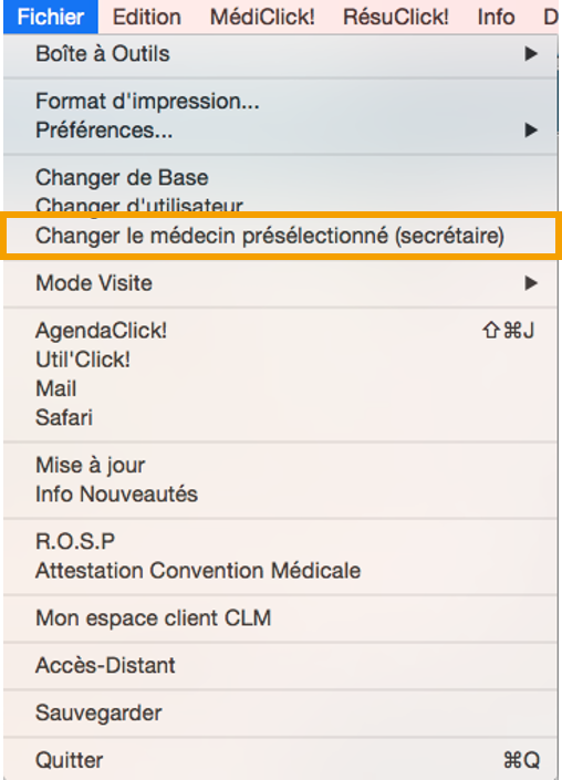 En revanche, si la secrétaire souhaite changer le professionnel de santé pour qui elle travaille, il lui suffit de cliquer sur le menu FichierChanger le médecin présélectionné (secrétaire).