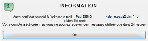 Validez le message confirmant la création de votre compte en cliquant sur Ok.