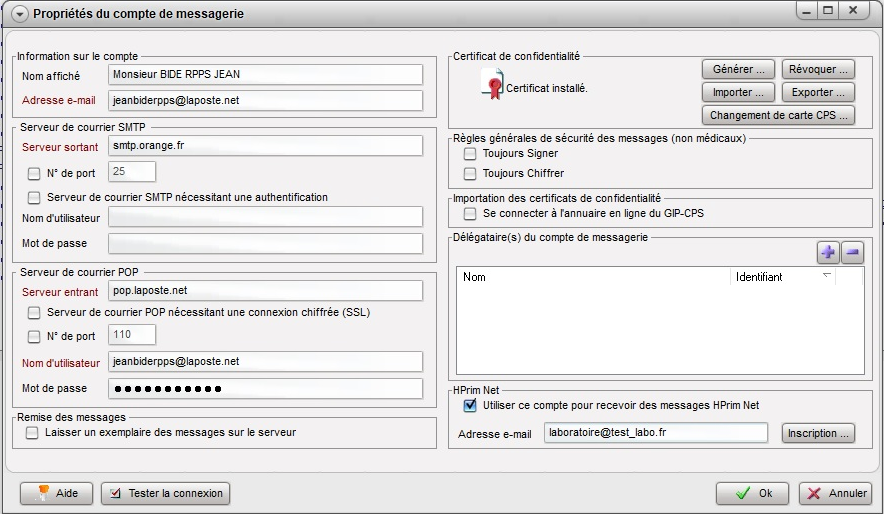 Si cela est nécessaire, cochez l'option Utiliser ce compte pour recevoir des messages HPrim Net,