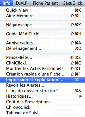 Pour imprimer le dossier d'un patient, accédez à la fonction Impression et Exploitation depuis le menu InfoImpression et exploitation.