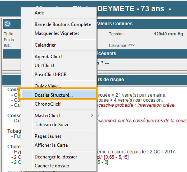 Pour cela, faites un clic-droit sur le bandeau, à côté du nom de votre patient, puis sélectionnez Dossier Structuré...