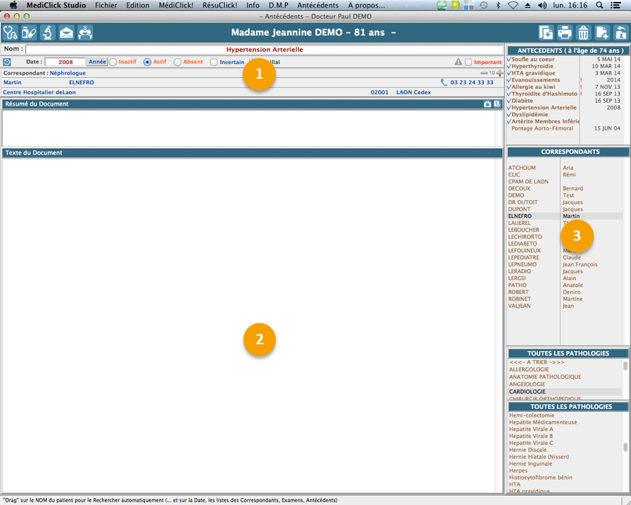 Caractère Incertain, Familial (affichage d'une liste déroulante), à mettre en Alerte (Fenêtre faisant irruption à l'ouverture du dossier) ou Important (pour distinguer la ligne par du rouge).