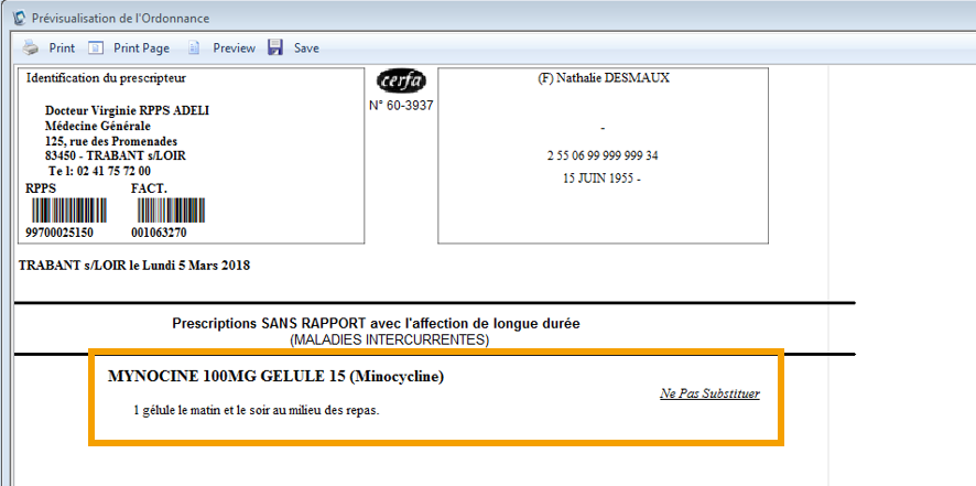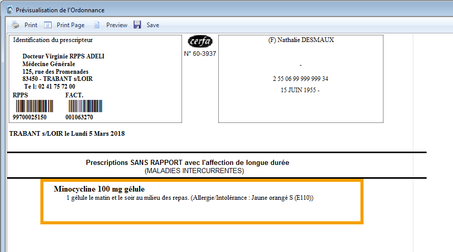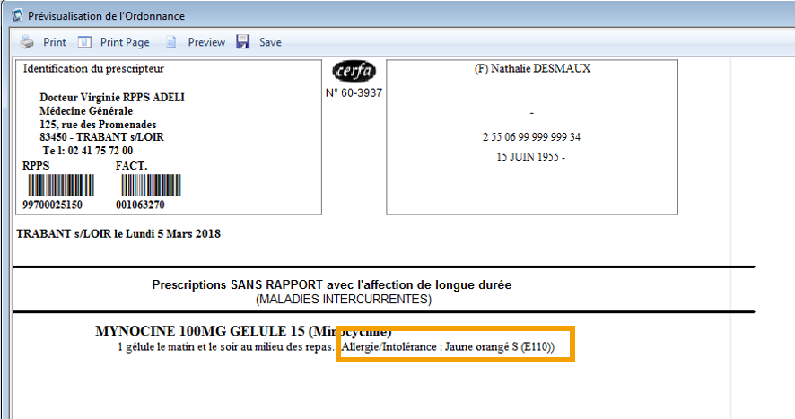3. Toutes fois, lorsque vous prévisualisez cette ordonnance, vous constatez que l'information concernant l'allergie, l'intolérance de votre patient apparaît :