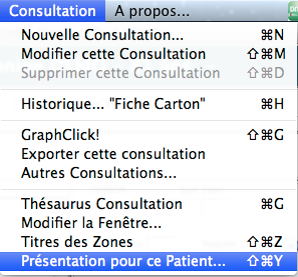 Après avoir ouvert le dossier du patient en question, depuis l'écran de consultation, cliquez sur le menu ConsultationPrésentation pour le patient.