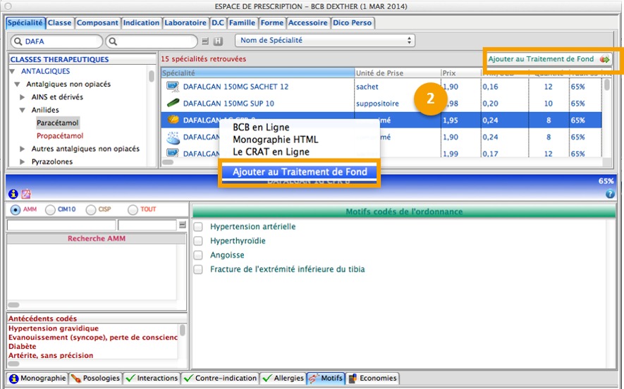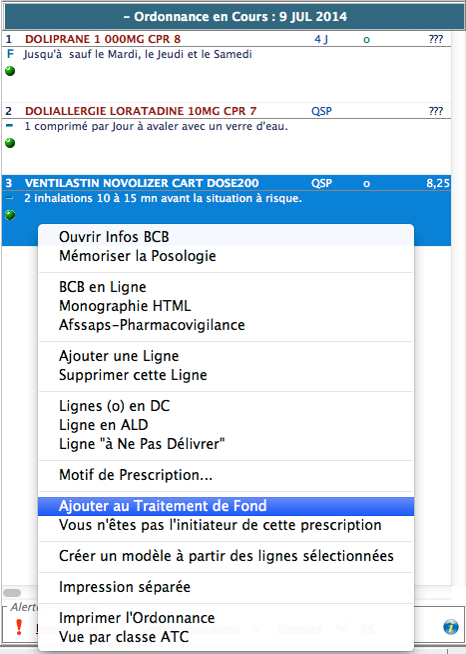 Ou encore depuis l'espace de prescription BCB Dexther en faisant un clic droit sur le médicament et Ajouter au traitement de fond :