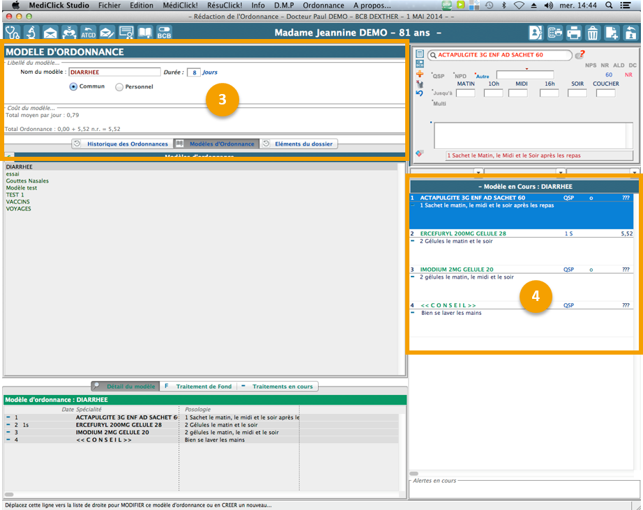 Les lignes de prescriptions du modèle s’affichent dans la zone de travail, elles peuvent être modifiées avec la calculette de prescription.