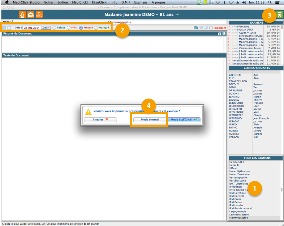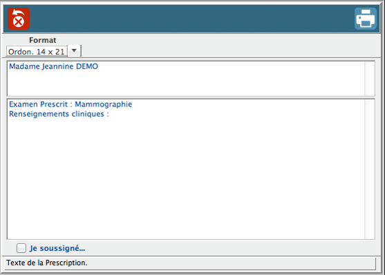 Les états d’impression d’examens complémentaires en mode normal (impression Ordo 14x21, Lettre 21x29 et A.L.D Bizone) reprennent le nom de l’examen prescrit comme dans les états d’impression Styl'Click!.