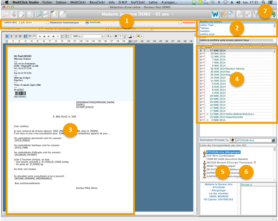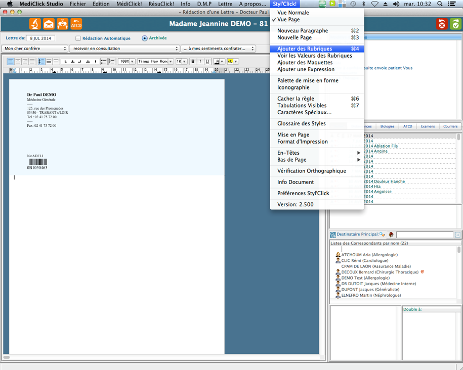 Depuis le menu StylClickAjouter des rubriques, dans l'onglet Médecin, retrouvez votre numéro de facturation en code barre que vous pouvez désormais ajouter à vos courriers.