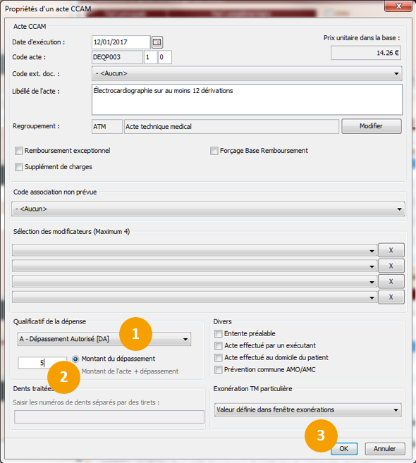 En cours d'élaboration d'une feuille de soins, vous avez la possibilité de saisir ponctuellement, un dépassement pour un acte.