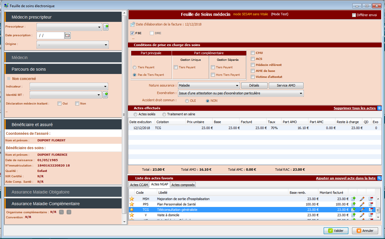 La feuille de soins s'ouvre, cotez l'acte TC ou TCG.