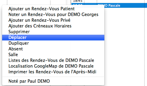 Il est possible de déplacer un RDV en effectuant un CTRL + clic (Mac) ou clic droit (PC) sur le RDV et sélectionnez Déplacer :