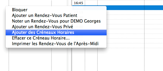 Il est possible d'ajouter un nouveau créneau horaire, en effectuant un CTRL + clic (Mac) ou clic droit (PC) sur un créneau libre et sélectionnez Ajouter des créneaux horaires.