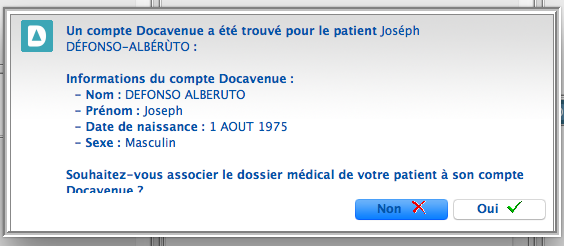 un message d'information vous indiquant qu'un compte Docavenue existe déjà pour votre patient s'ouvre et vous demande si vous souhaitez l'associer avec votre dossier médical :