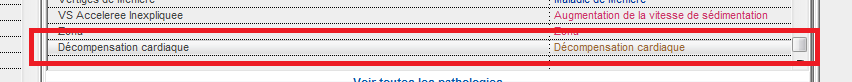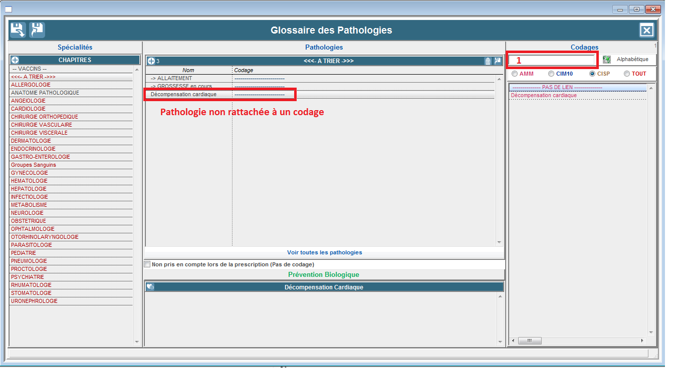 Une telle pathologie non codifiée CIM10 dans votre glossaire est indiquée par des traits en pointillés dans la colonne Codage, à droite du nom Décompensation cardiaque.