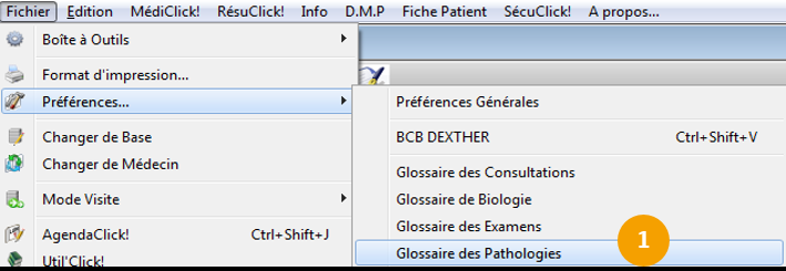 1. Accédez à votre glossaire des pathologies, depuis le menu FichierPréférencesGlossaire des pathologies.