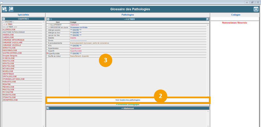 3. Dans la liste Toutes les pathologies, recherchez et vérifiez si l’ensemble des termes définis dans votre glossaire, utilisés pour décrire les pathologies suivantes en consultation, sont bien associés à un codage CIM10.