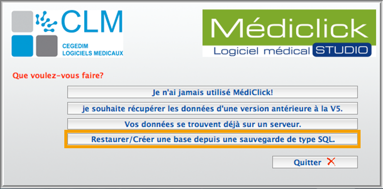 3. Lancez votre logiciel MédiClick. Sur cette fenêtre sélectionnez le choix Restaurer/Créer une base depuis une sauvegarde de SQL :