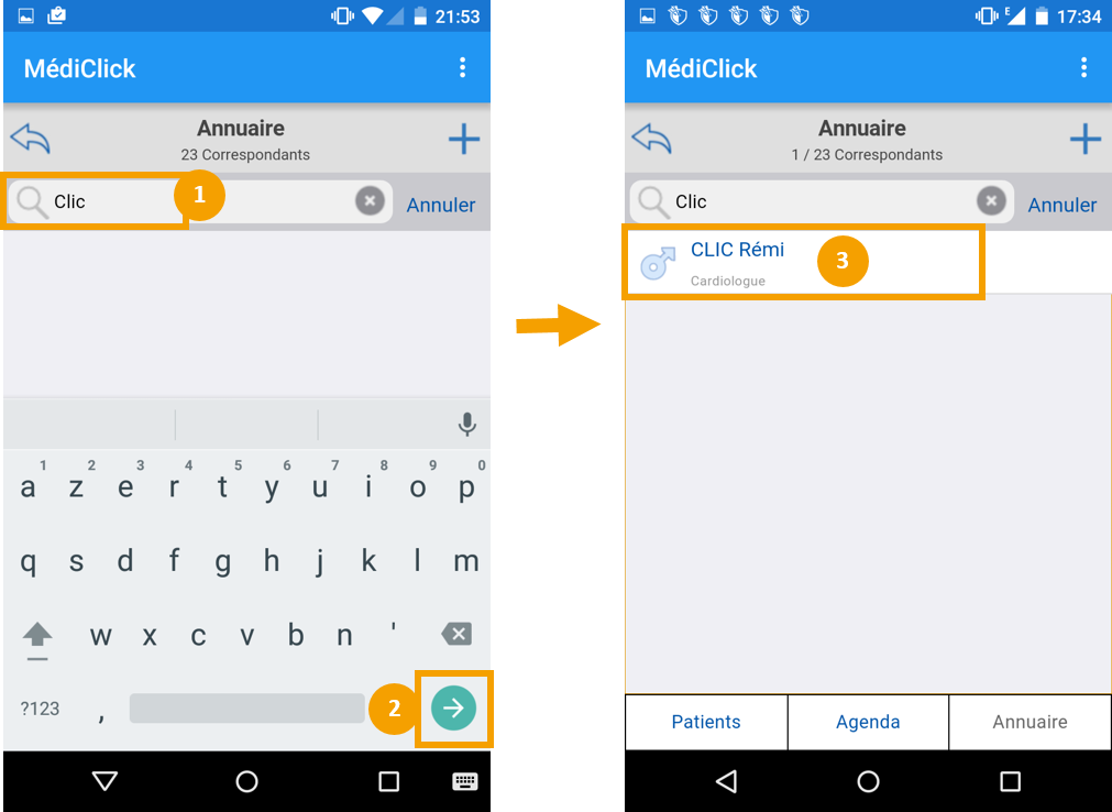 Pour rechercher un correspondant par sa spécialité, saisissez un @ devant la spécialité (ex : @cardiologue)