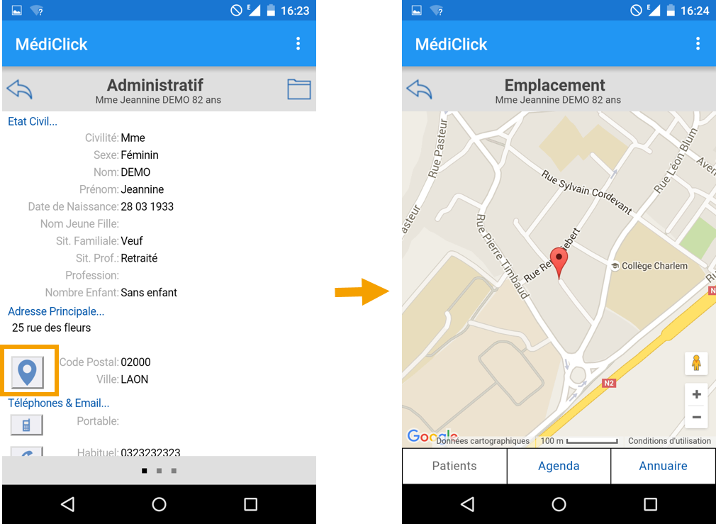 | . | Aide en ligne MédiClick - version 5.18.02 > La coordination entre MédiClick et MLM > Découverte de MédiClick Mobile Édition > La fiche administrative > Géolocaliser un patient depuis sa fiche administrative |
