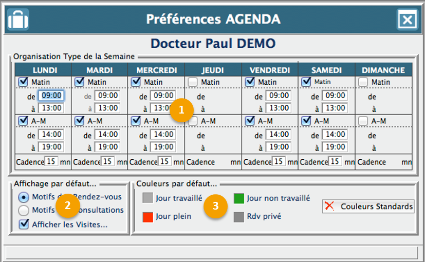 Dans ce cadre, sélectionnez les éléments à afficher par défaut dans l'agenda (Motif de RDV ou de consultation et affichage des visites).
