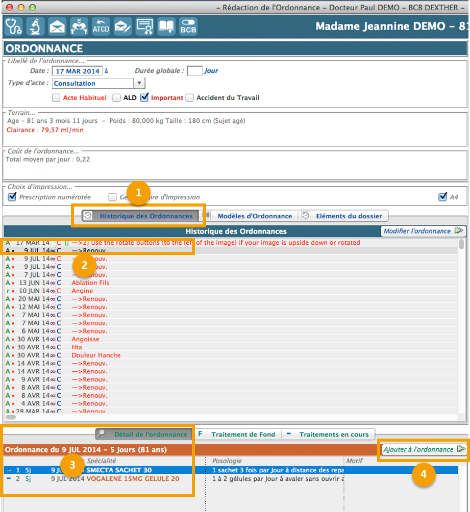 4. Cliquer sur pour renouveler toute l’ordonnance. Pour ne renouveler qu’une partie de l’ordonnance, double-cliquer sur les lignes choisies.