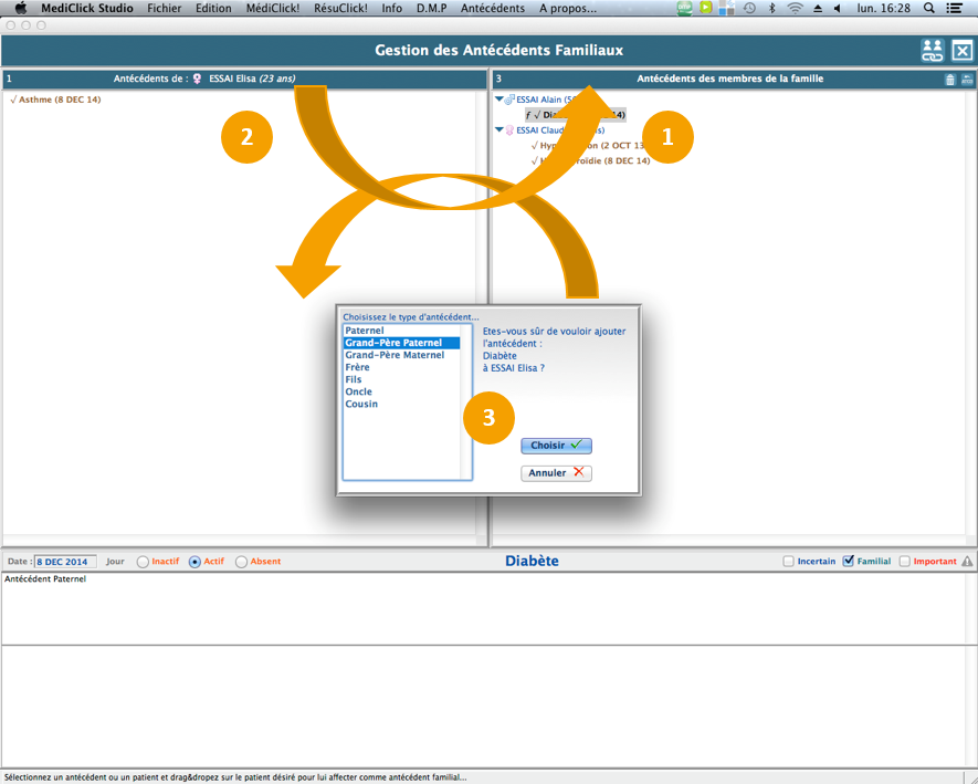 2. Utilisez la fonction Glisser déposer pour faire basculer l'antécédent dans la liste des antécédents du patient chargé ou encore sur le membre de la famille souhaité.