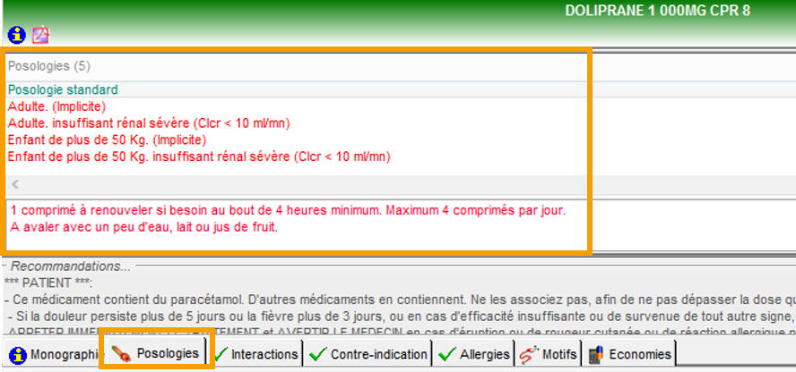 Une liste de posologie s’affiche avec, en tête, la posologie standard. Cliquez sur une ligne pour sélectionner la posologie souhaitée.