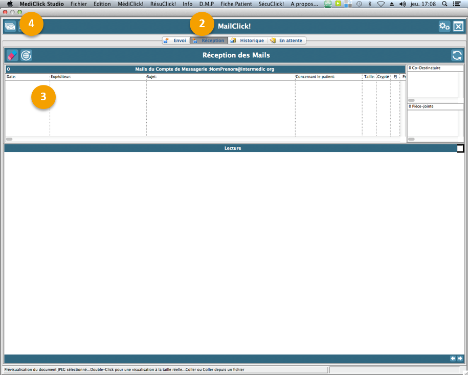 2. Vous êtes dans la fenêtre MailClick. La réception des documents se fait automatiquement, MédiClick récupère les analyses ou courriers et les décrypte aussitôt.