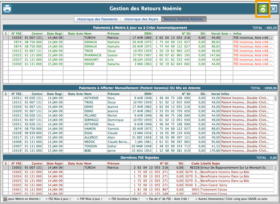 En bas de la fenêtre, on visualise les dernières FSE rejetées et le libellé du rejet.