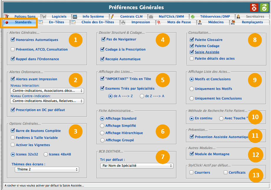 Dans l'onglet Standards des Préférences générales de MédiClick, il est possible de paramétrer ou modifier l'utilisation :