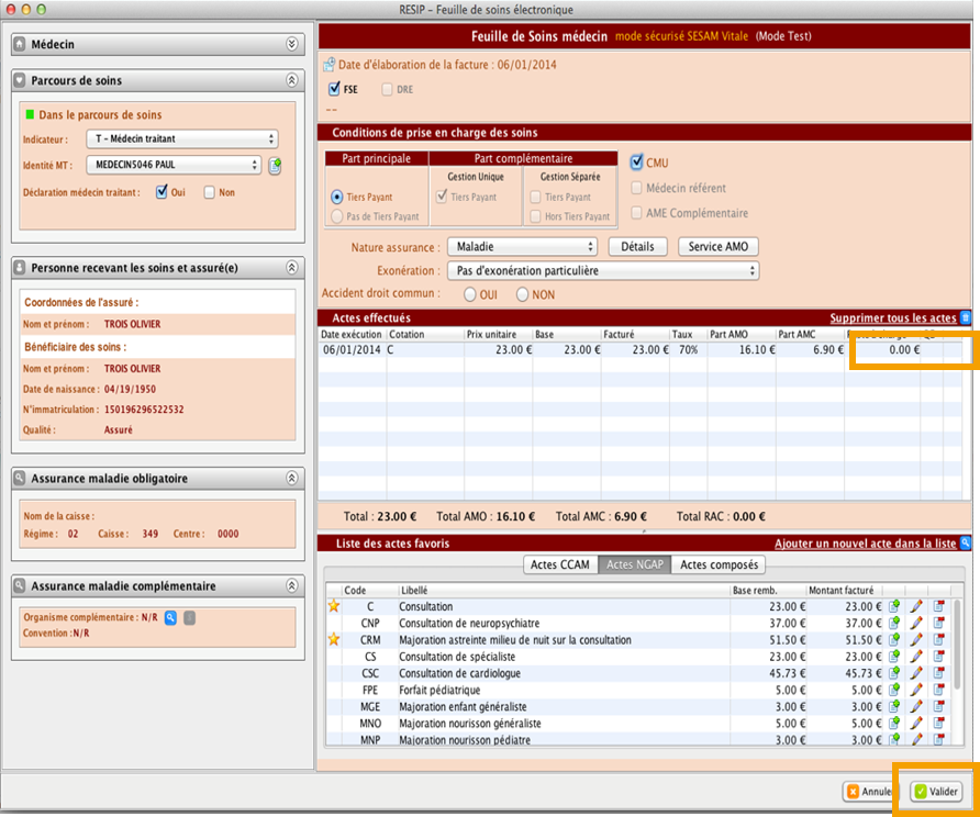 Si le patient est bénéficiaire de la CMU, les droits sont généralement renseignés sur la carte vitale du patient et le logiciel prend automatiquement en compte les droits CMU du patient. Si la carte vitale du patient n’est pas à jour, il faut forcer les droits CMU du patient :