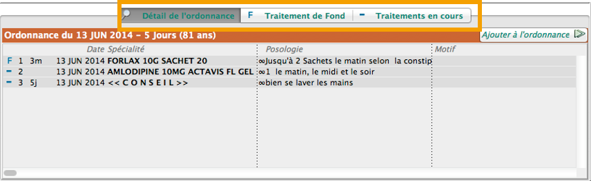 Historique des Ordonnances. Dans cet onglet, les ordonnances sont rangées par ordre chronologique (la plus récente au sommet de la liste). Par défaut, l’affichage se fait sur la dernière consultation dite chronique (qui contient le Traitement Habituel du patient). Tous les actes se référant au traitement habituel du patient sont signalés par une puce rouge.