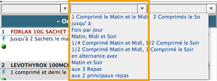 la Posologie de la prescription. Trois listes déroulantes, issues des glossaires des conseils d’ordonnance permettent d’enrichir la posologie :