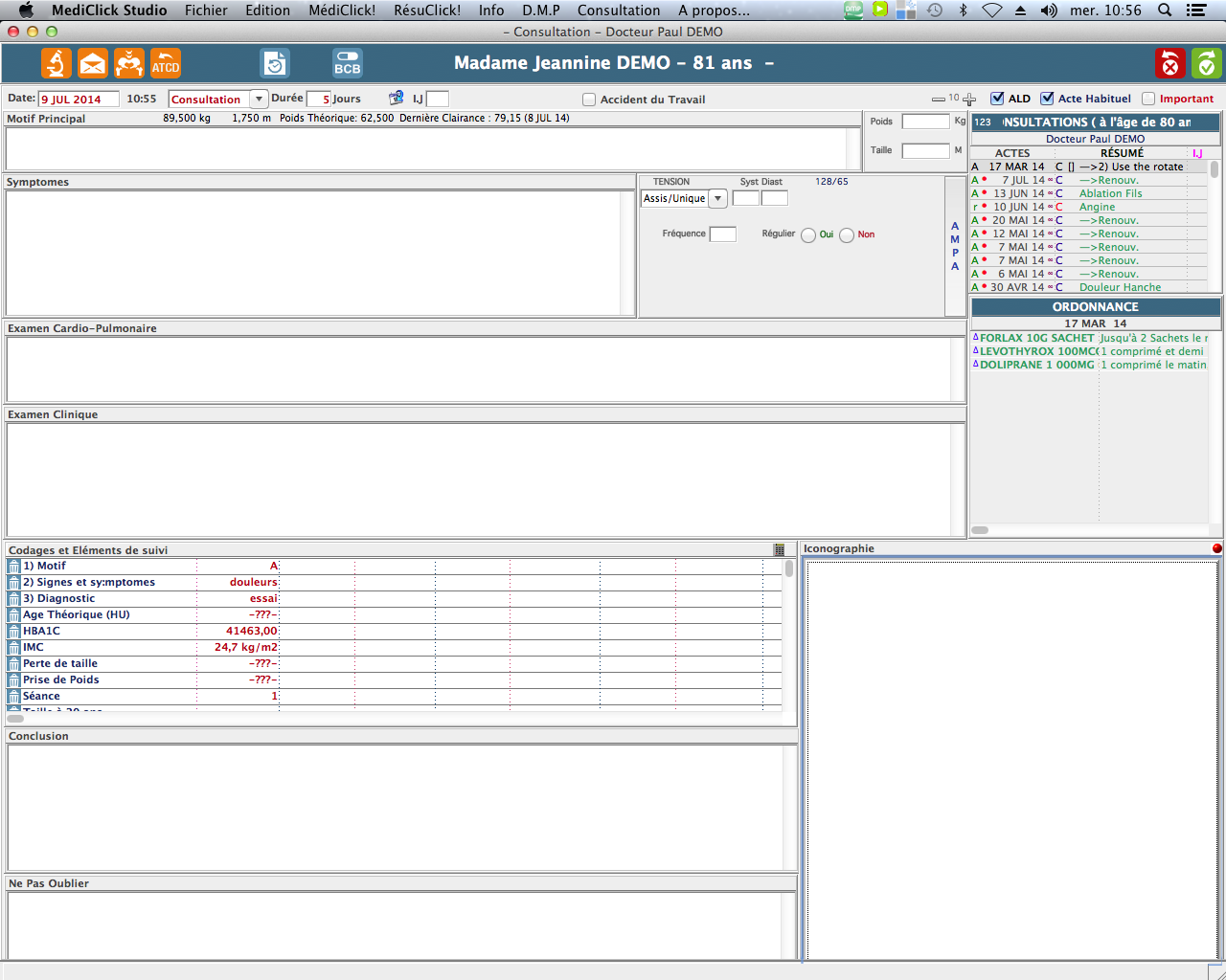 Elle reprend l'historique des consultations par Date des Actes (Tri anti-chronologique) et le Motif : en cliquant sur une ligne de consultation, on fait apparaître dans la liste sous-jacente l'ordonnance correspondant à cette consultation.