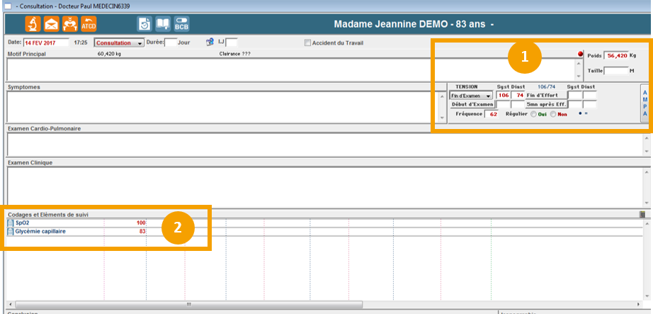 2. Dans les éléments de suivi de la consultation, pour les valeurs prises par l'oxymètre et le glucomètre.