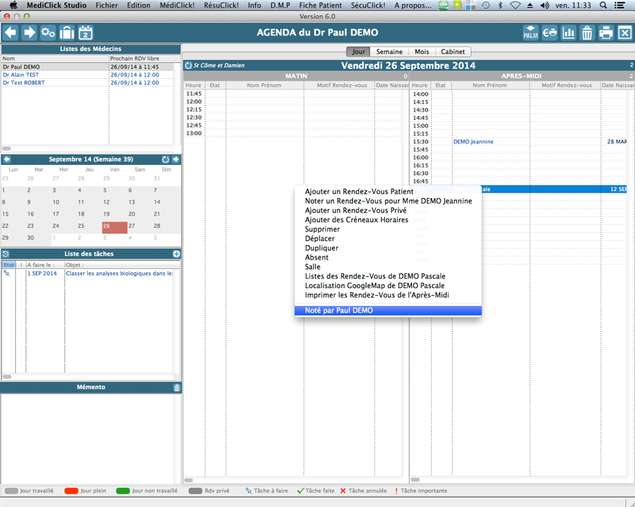 Un médecin peut également signer un RDV notamment pour préciser que c'est lui qui a pris le RDV. Pour signer un RDV il suffit d'effectuer un CTRL + clic ou clic droit sur le RDV pour accéder au menu contextuel et cliquer sur Noté par Dr...
