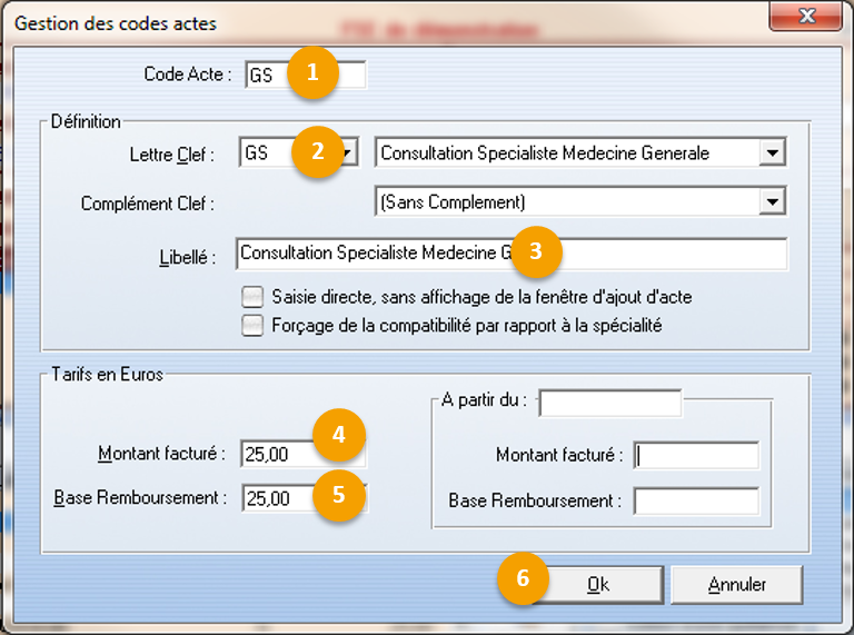 Le Code Acte, la Lettre Clef, le Libellé, ainsi que le Montant facturé et la Base de Remboursement sont obligatoires. |