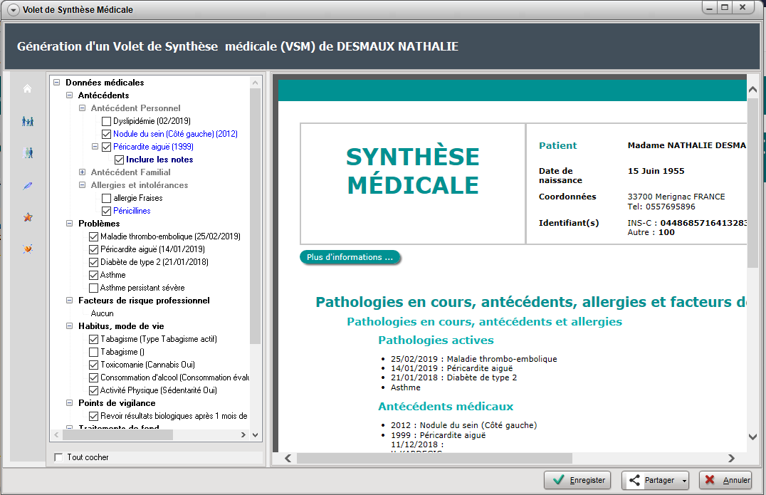7. Cochez les données médicales, en haut à gauche, que vous souhaitez intégrer. Pour vous aider dans cette sélection, le dossier de votre patient apparaît sur la droite et se met à jour dynamiquement en fonction des sélections/désélections que vous réalisez.