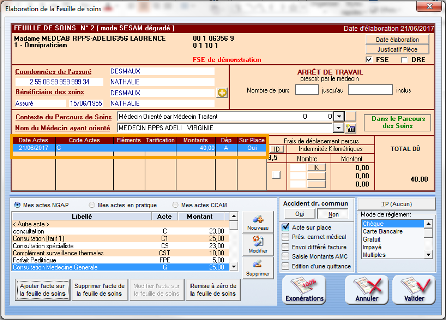 Cliquez sur le bouton Ajouter l'acte sur la feuille de soins,