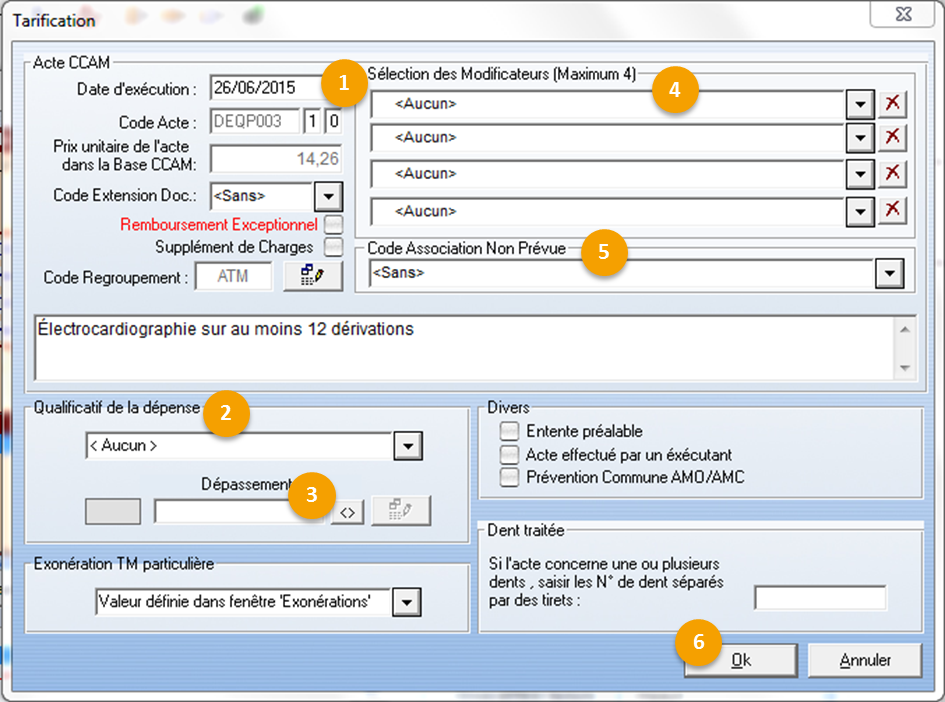 4. Sélectionner des Modificateurs (F Actes en urgence dimanche ou jour férié, U Urgence hors pédiatres et omnipraticiens nuit 20h - 8h, etc...),