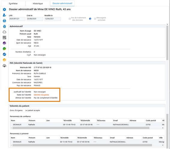 Si l'INS a bien été récupéré le dossier administratif et le statut d'identité du patient sont mis à jour.
