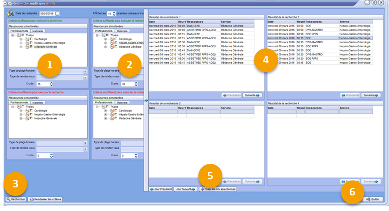Ce menu permet de rechercher des créneaux disponibles, afin de poser des rendez-vous pour plusieurs spécialités à la suite.